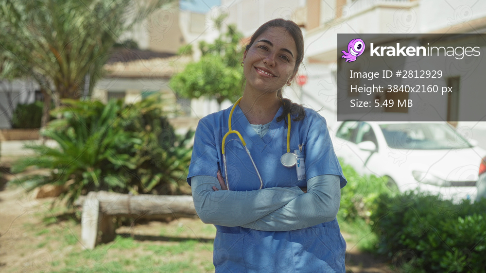 Hispanic woman doctor with stethoscope crosses arms and smiles in green park setting; denial resistance rejection.