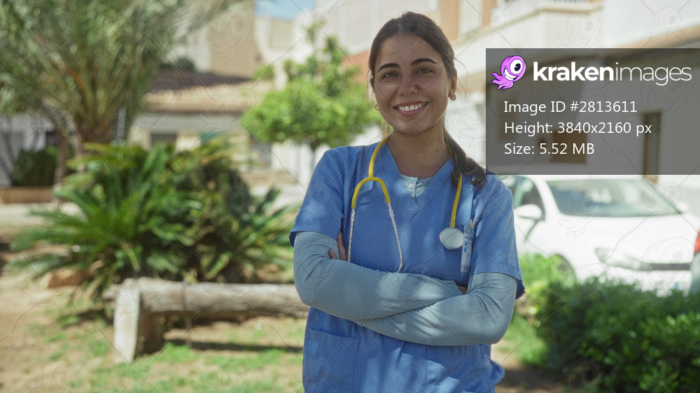 Hispanic woman doctor with stethoscope crosses arms and smiles in green park setting; denial resistance rejection.