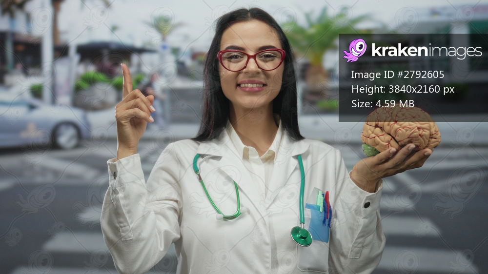 Hispanic woman doctor with stethoscope holds brain and gestures idea on street outdoor with confidence.