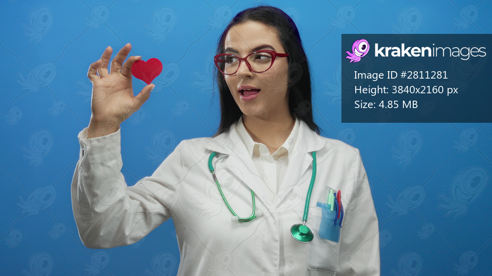Hispanic woman doctor with stethoscope holds heart shape on blue background, symbolizing healthcare and compassion.