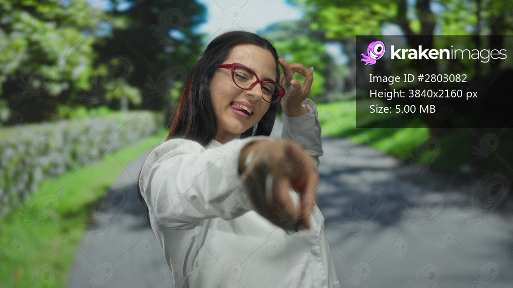 Hispanic woman doctor with stethoscope smiles in a park, wearing a uniform and red glasses, capturing a moment of outdoor healthcare professional ambiance in a natural setting. - Kraken Images