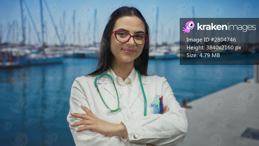 Hispanic woman doctor with stethoscope smiling confidently outdoors at a marina with boats and blue water in the background on a sunny day.