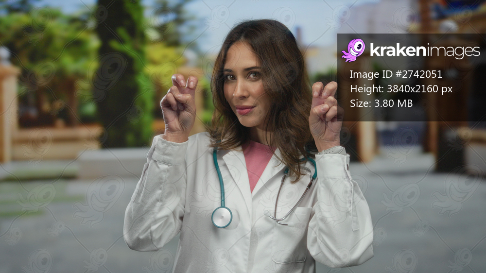 Hispanic woman doctor with stethoscope smiling confidently outdoors in a city street setting.