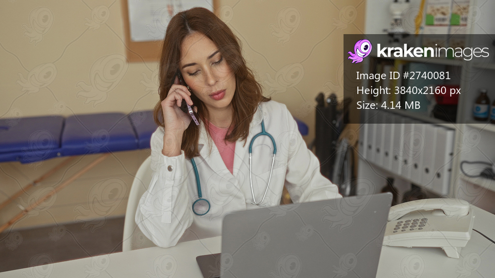 Hispanic woman doctor with stethoscope talking on phone in hospital office, surrounded by medical equipment and papers, conveying professionalism in healthcare environment. - Kraken Images