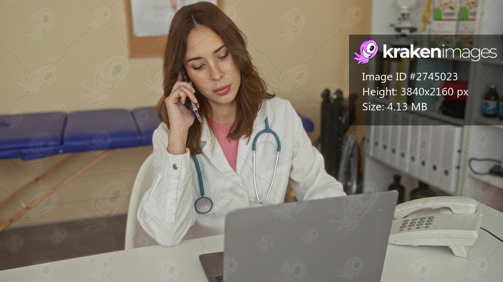 Hispanic woman doctor with stethoscope talking on phone in hospital office, surrounded by medical equipment and papers, conveying professionalism in healthcare environment. - Kraken Images