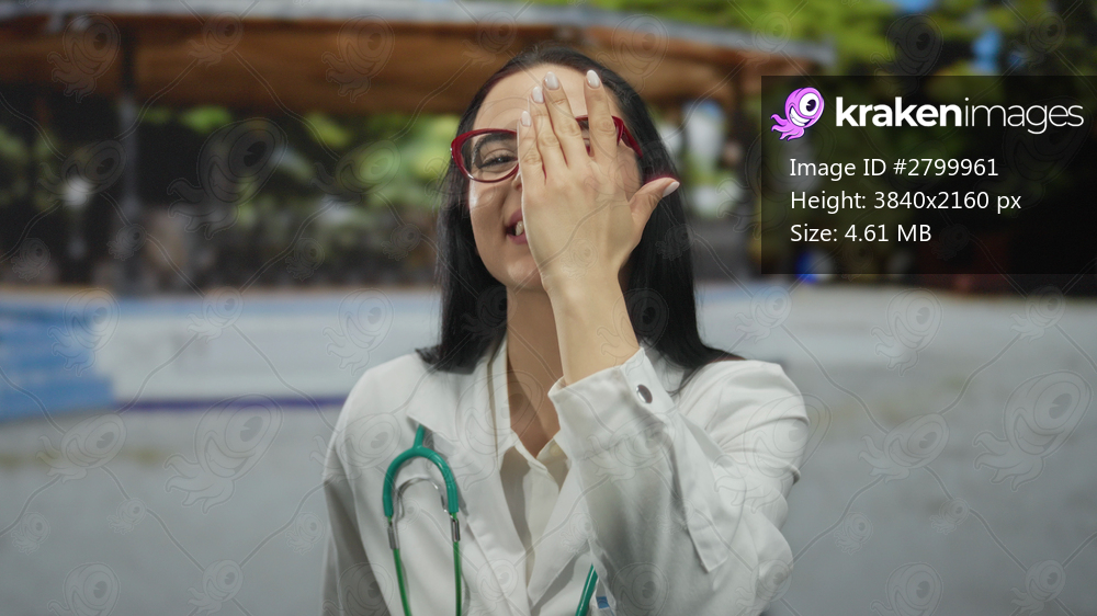Hispanic woman doctor wearing stethoscope smiling in park with colorful outdoor setting showcasing professional attire and joyful demeanor in public space. - Kraken Images