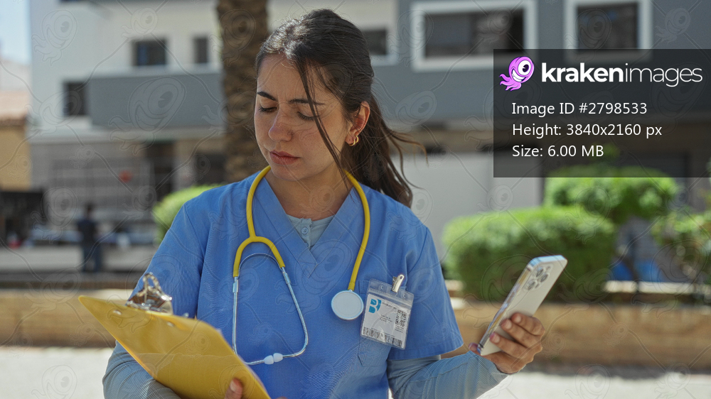 Hispanic woman doctor wearing uniform and stethoscope checking phone outdoors on sunny street, holding clipboard, working on the go in urban environment with medical focus. - Kraken Images