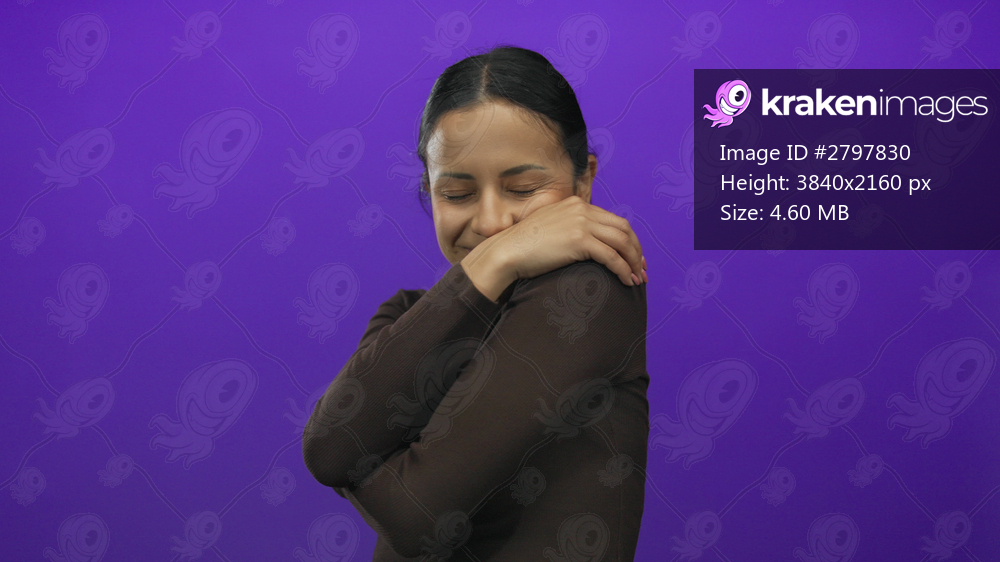 Hispanic woman embraces herself joyfully against an isolated purple background, expressing self-love and confidence in a modern setting.