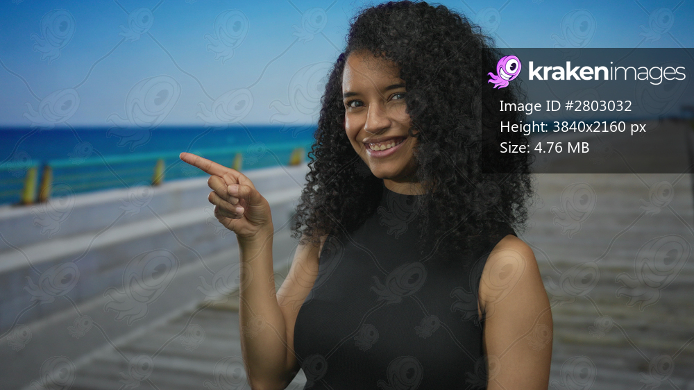 Hispanic woman enjoys a sunny day on a seaside promenade with the ocean in the background, capturing a moment of joy and relaxation outdoors.