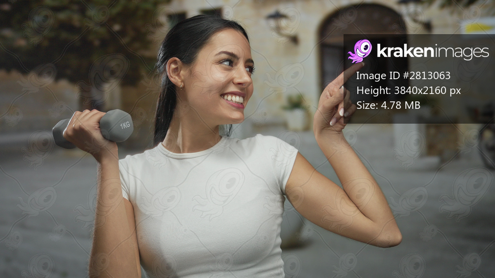 Hispanic woman exercising with dumbbell outdoors smiling in sunny urban area pointing aside confidently