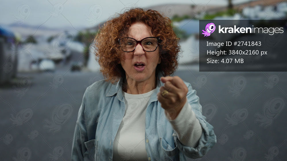 Hispanic woman expresses anger in city street, wearing casual denim and glasses on an overcast day, emphasizing emotion and urban environment.