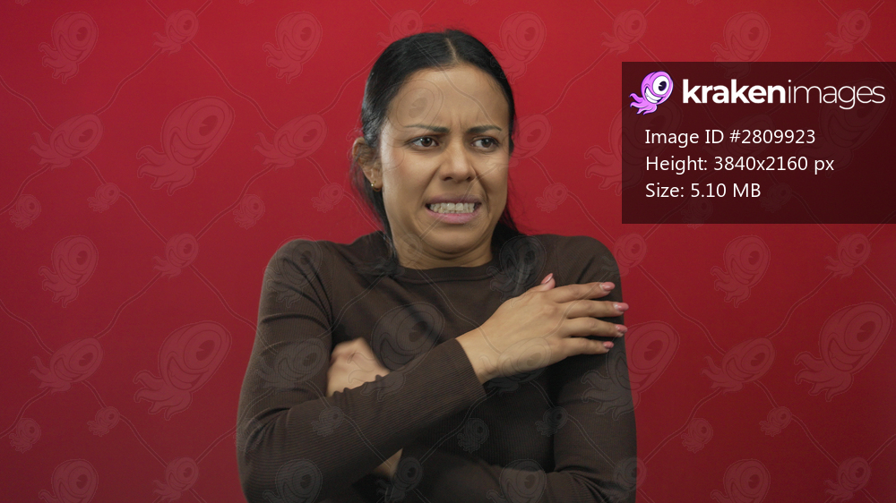 Hispanic woman expressing cold discomfort over red background, clutching her arms in a brown sweater, isolated and emotional.