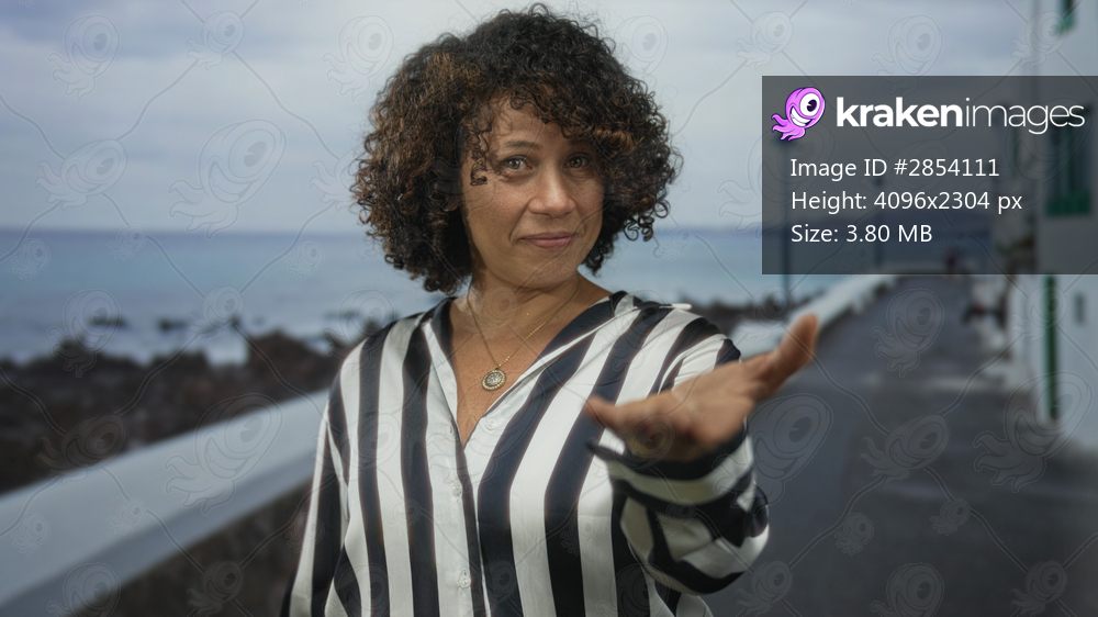 Hispanic woman extends open hand with palm forward on street by the seaside promenade; welcoming warmth.