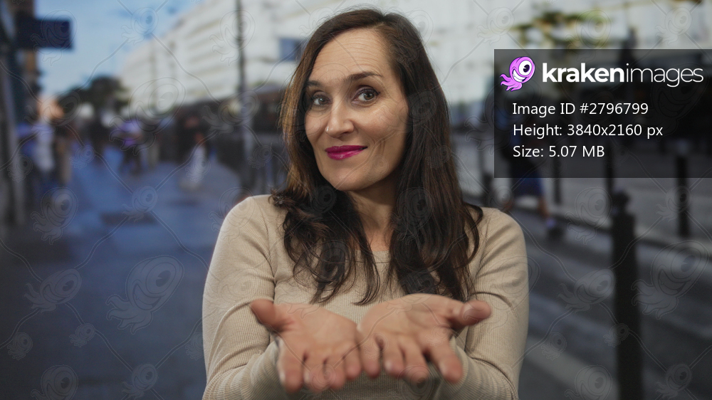 Hispanic woman extends open palms toward camera in a busy urban street scene; invitation openness warmth kindness.