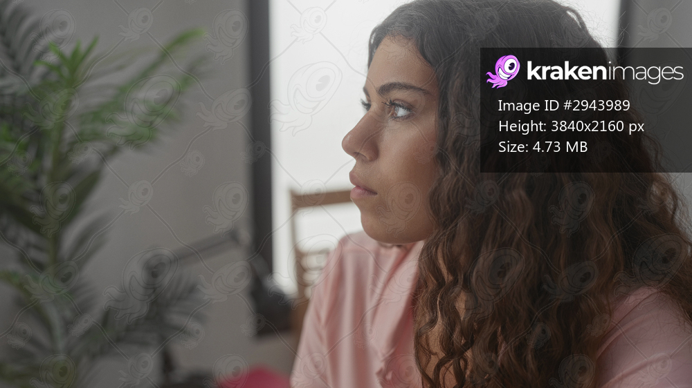 Hispanic woman with eyes closed in profile beside a houseplant and lamp in a studio, seated and softly backlit; reflection calm.