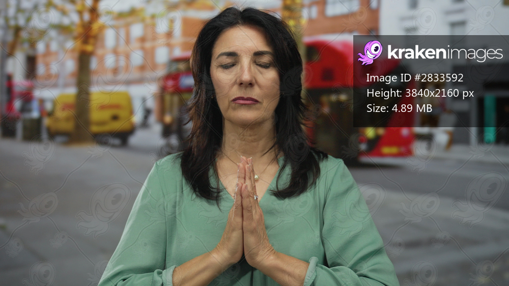Hispanic woman with eyes closed pressing palms together at chest in prayer gesture on city street bus stop; calm reflection.