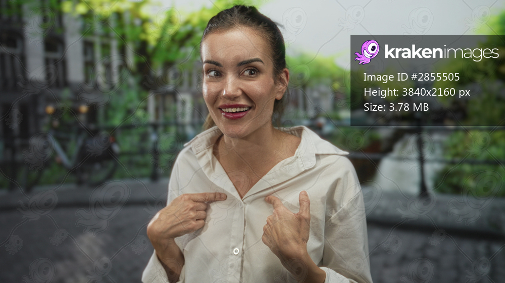 Hispanic woman finger pointing to chest on cobblestone street by canal; surprise doubt self assertion.