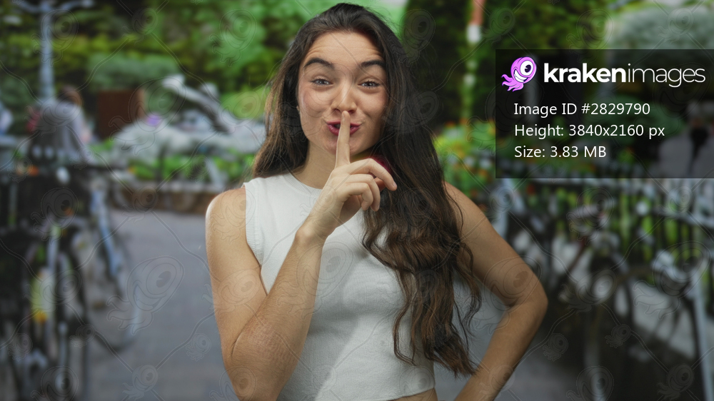 Hispanic woman finger to lips for silence as she stands before a row of parked bicycles on urban street; secrecy.