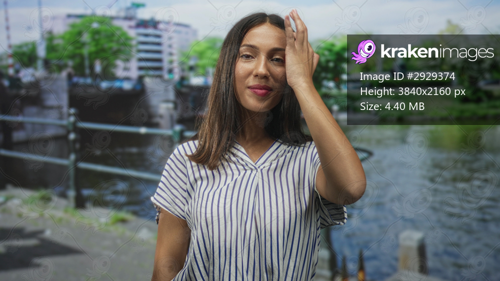 Hispanic woman with fist extended toward camera on street in amsterdam; confidence empowerment joy pride.
