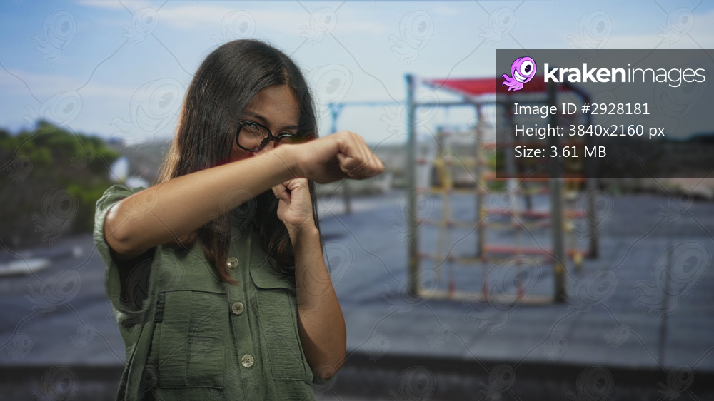 Hispanic woman with fists up in a boxing pose on a building rooftop playground, wearing glasses and green shirt; self defense determination.