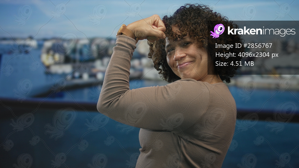 Hispanic woman flexes bare bicep aboard a boat deck at port in daylight, smiling with closed eyes; confidence.