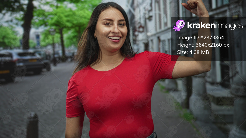 Hispanic woman flexes bicep and raises clenched fist on city street with trees and parked cars visible while smiling and looking to the side; confidence empowerment strength. - Kraken Images