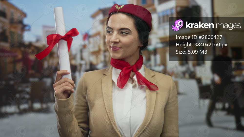 Hispanic woman flight attendant celebrating graduation with diploma on a lively street setting outdoors, embodying success and achievement.