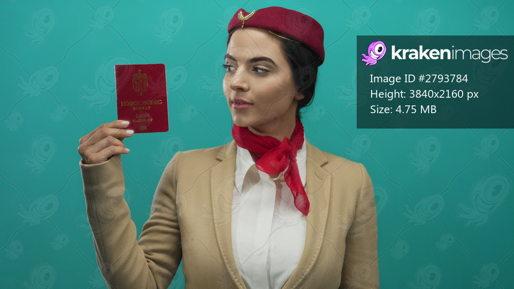 Hispanic woman flight attendant in uniform holding norway passport against vibrant green wall background showcasing identity and professionalism.