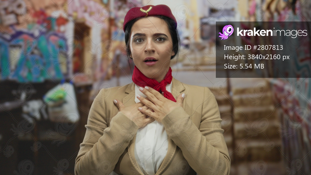 Hispanic woman flight attendant in uniform looking concerned outdoors on a city street.