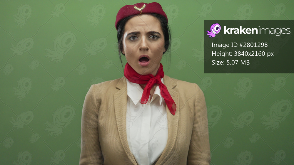 Hispanic woman flight attendant makes rejecting gesture with hands in uniform against green wall.