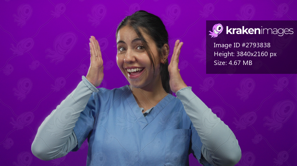 Hispanic woman frames head with hands and smiles in purple studio, creating a human frame around her face; playful creativity.