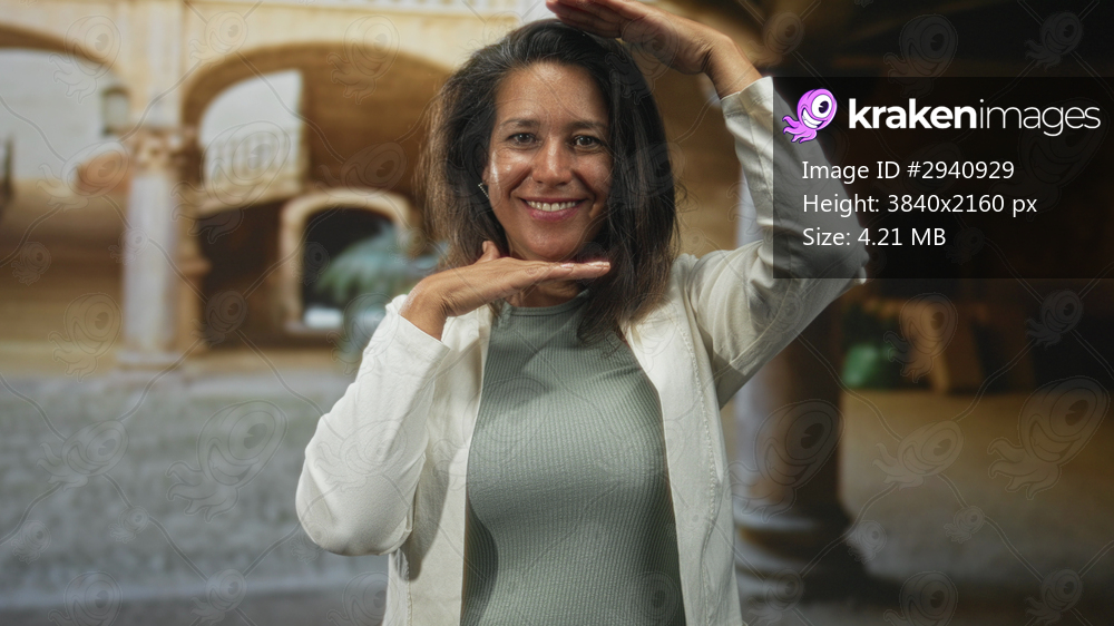 Hispanic woman framing face with hands in an arched building courtyard, smiling in a warm pose; welcoming joy.