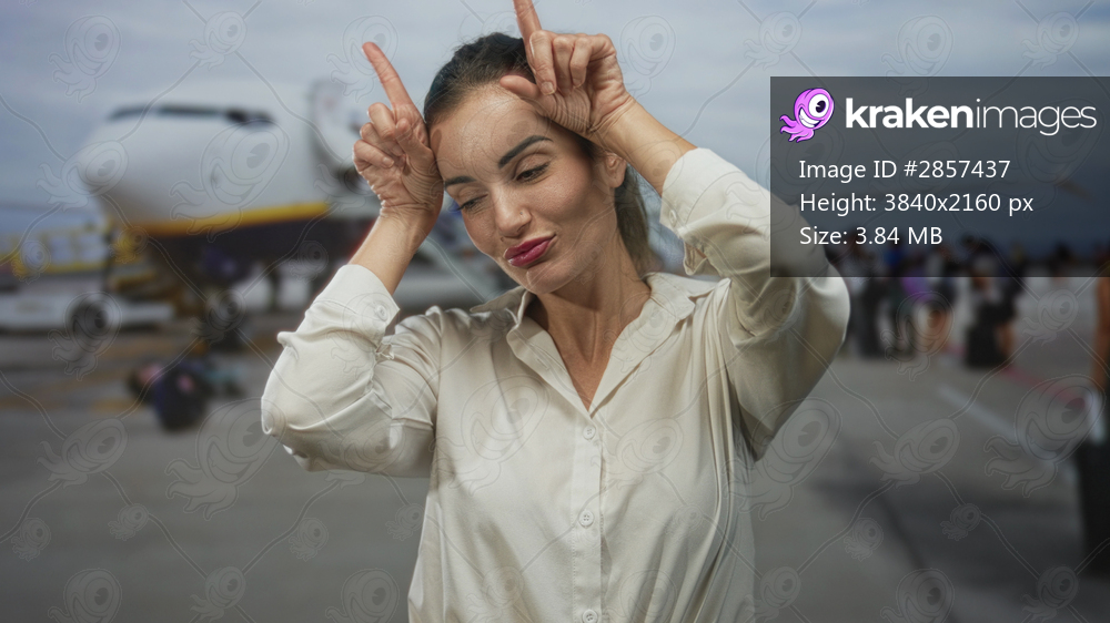 Hispanic woman gestures with raised hands in front of white airplane at outdoor airport ramp; travel excitement.
