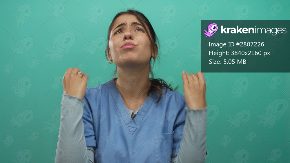 Hispanic woman gesturing in blue scrubs against a vibrant green background, expressing confusion and concern.