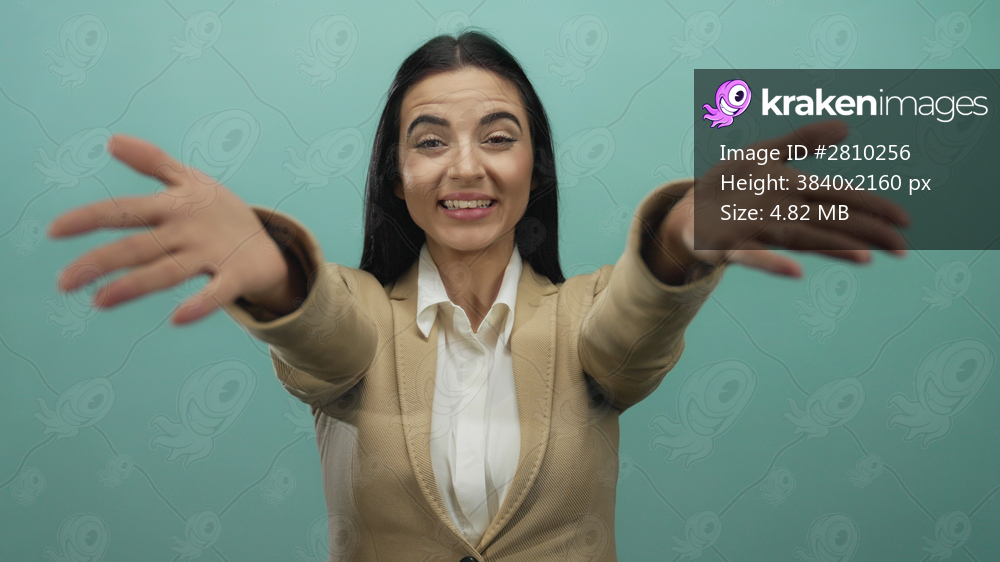 Hispanic woman gesturing welcome with hands extended against green wall, exuding warmth in a beige blazer and white shirt.