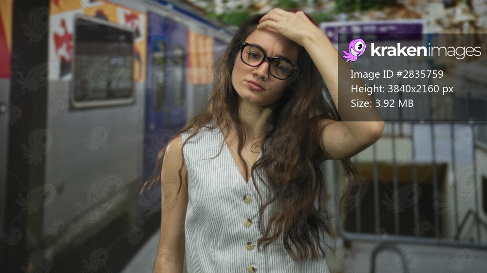 Hispanic woman with glasses crossing arms at sunny train station platform near arriving train carriage; rejection.