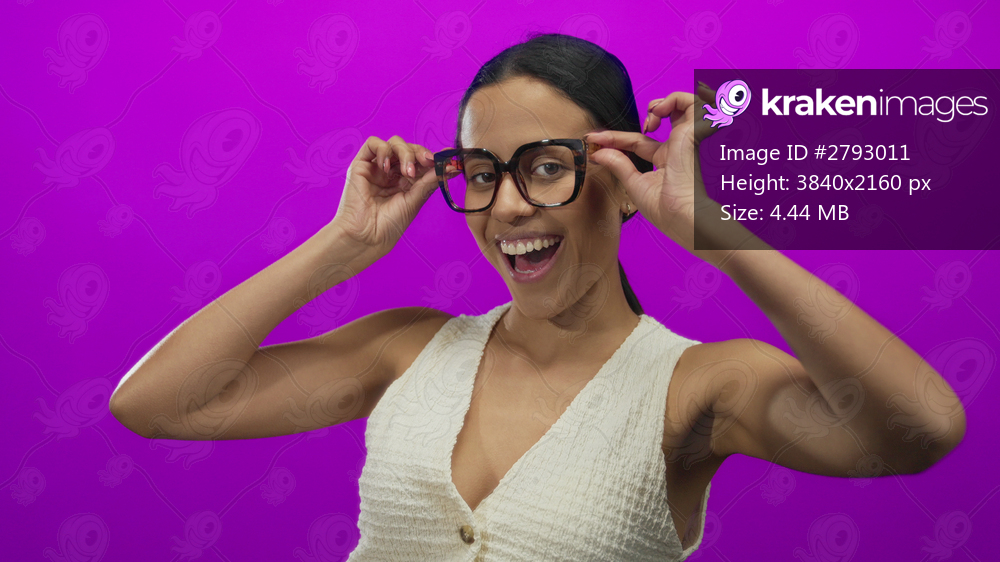 Hispanic woman with glasses gives a thumbs-up over a vibrant pink background, radiating positivity and confidence.
