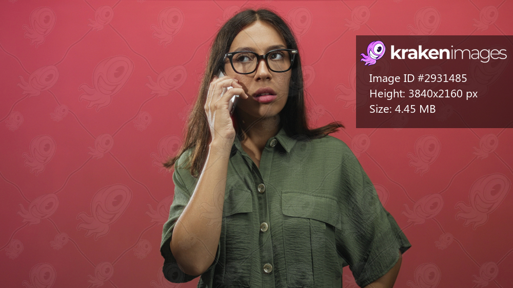 Hispanic woman with glasses holding smartphone to ear and tilting head in red studio; annoyance communication.
