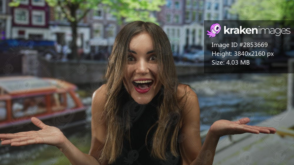Hispanic woman grins and raises hands in shrug beside sunlit water canal by historic building; excitement.