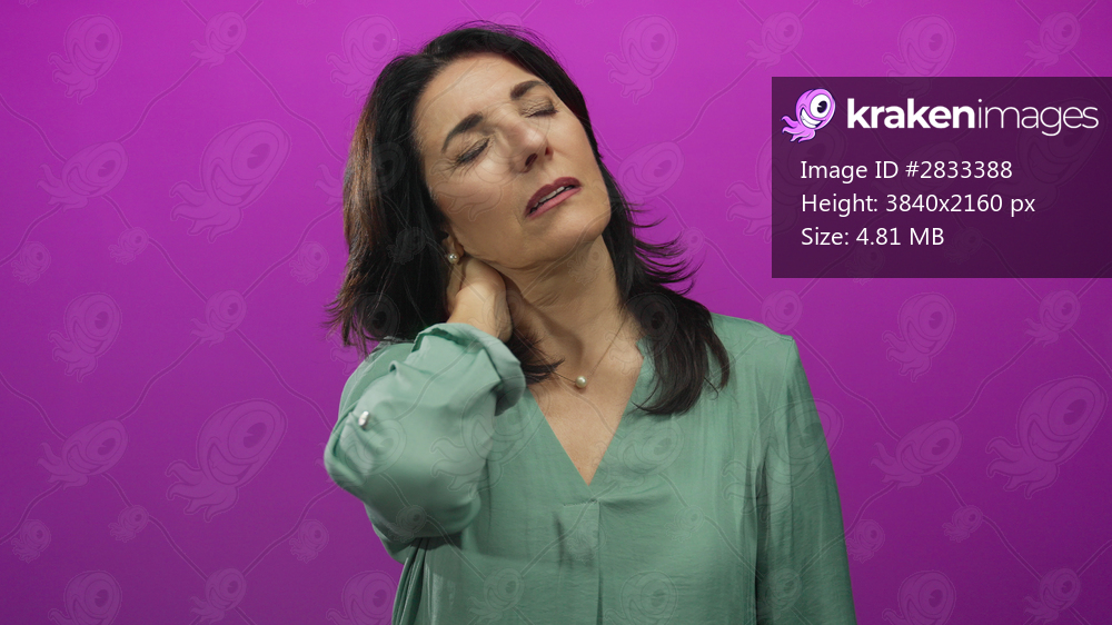 Hispanic woman grips neck to relieve muscle tension and stiffness against vibrant purple studio wall; discomfort.