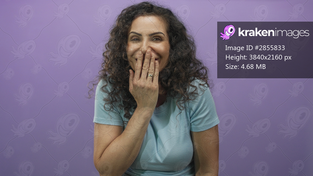 Hispanic woman with hand covering mouth and playful expression in purple studio setting wearing light blue shirt; surprise.