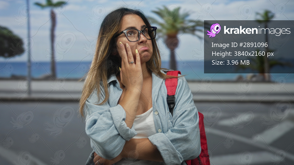 Hispanic woman with hand on cheek and crossed arms wearing glasses and red backpack on street by palm trees and ocean promenade; pensive uncertainty.