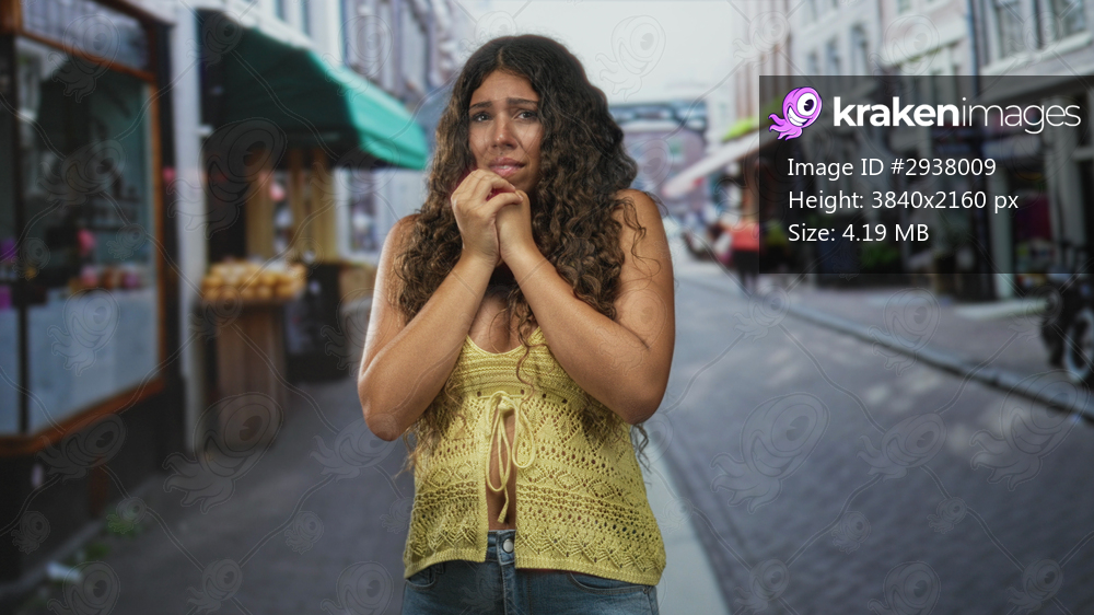 Hispanic woman with hands clasped to face, pleading gesture on a crowded street market; anxiety vulnerability.