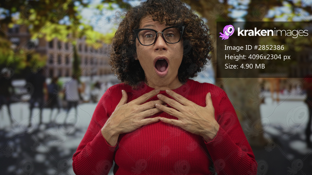 Hispanic woman with hands on chest standing on busy city street under leafy trees in bright sunlight; surprise.
