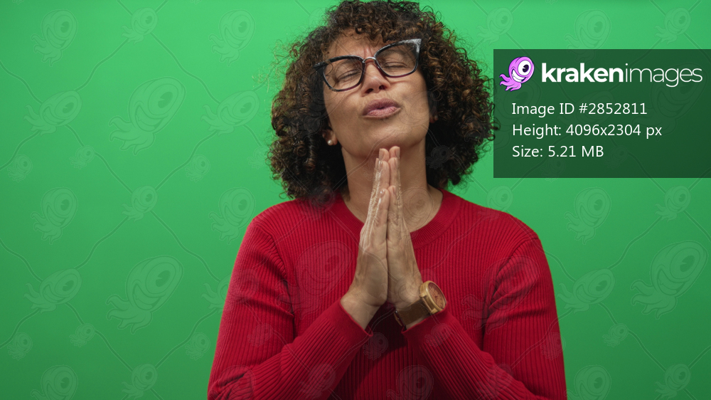 Hispanic woman hands pressed together prayer in green studio wearing red sweater and glasses; hope.