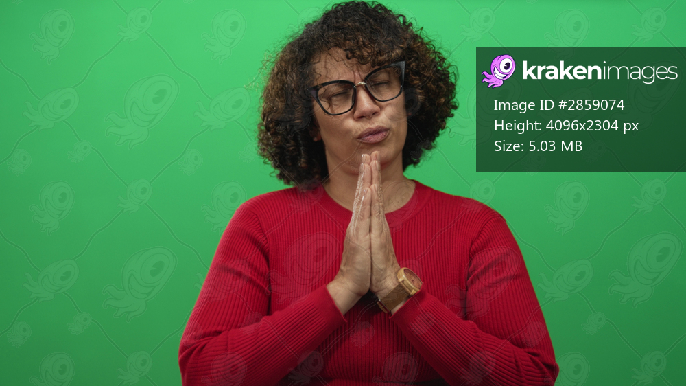 Hispanic woman hands pressed together prayer in green studio wearing red sweater and glasses; hope.