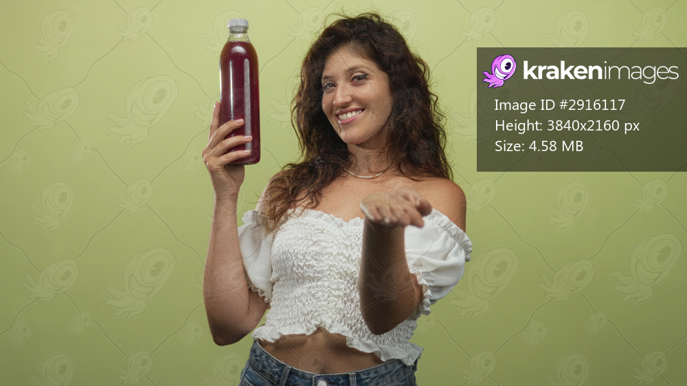 Hispanic woman holding a bottle and offering open palm while smiling in green studio; detox health boost cheerful.