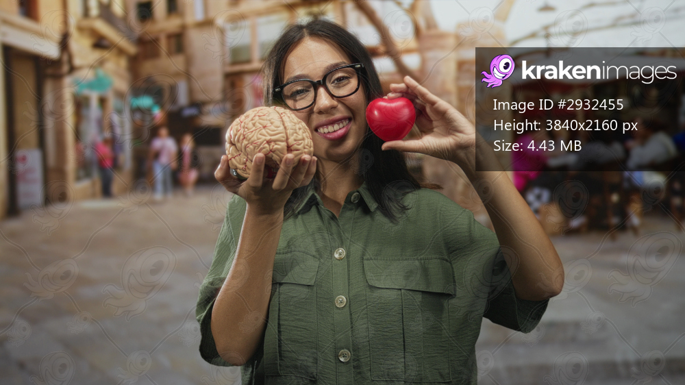 Hispanic woman holding a brain model in her left hand and a red heart in her right hand on a street cafe scene; mind heart choice playful.
