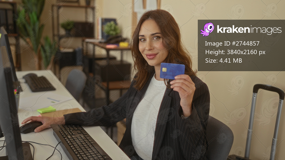 Hispanic woman holding a credit card in an office setting, showcasing business attire while sitting at a workstation, emphasizing professional and financial themes indoors. - Kraken Images