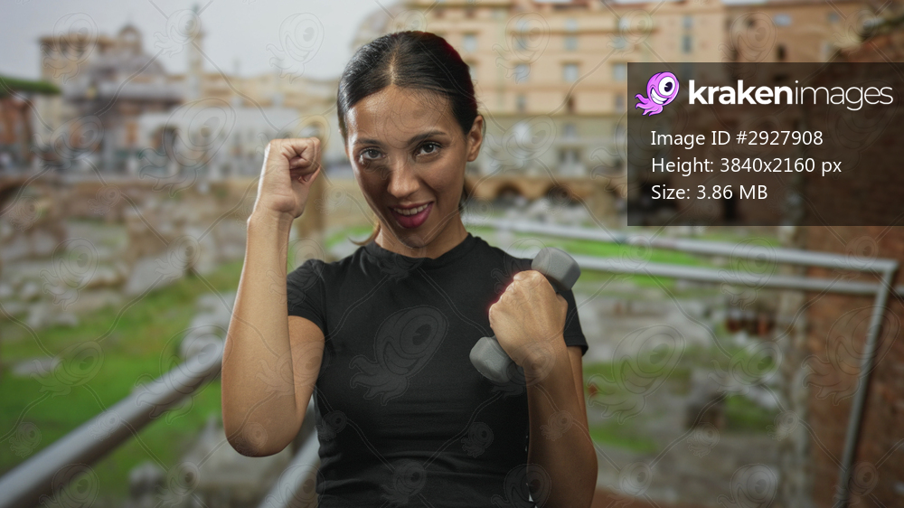 Hispanic woman holding a dumbbell and raising her fist at roman ruins building while smiling and posing; determination.